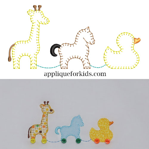 So sweet and sized for the lille ones. Greta on a yoke, collar,onsie,bibs, blankets, etc. Add the decroative little 1/8 to 1/4" buttons to complete the pull toy look. These are tiny appliques with a blanket stitch that gives it a hand sticthed look. If you want eyes, a little hand French knot or satin stitch will work.