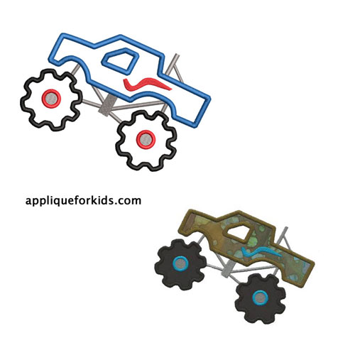 Boys love the monster trucks! But so do girls - so try a pink one for them! Very easy 2 stop applique design.The small for the 4x4 hoop will have round wheels.