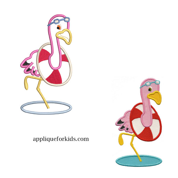 Flamingo is ready for his swim! One of several whimsical flamingo's of a set.