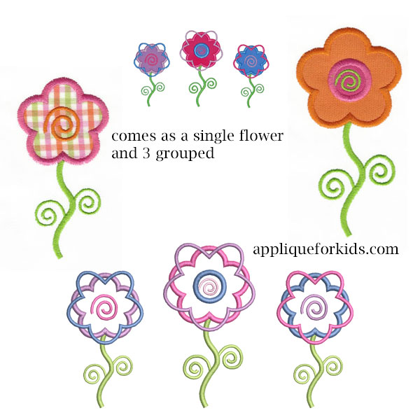 FUN fun flowers! Great for working with the many colors in a piece of fabric! They come set with the outline swirl on top of the applique flower - but if you don't want this swirl on top - just forward your machine past it for a totally different looking flower! Very versatile!