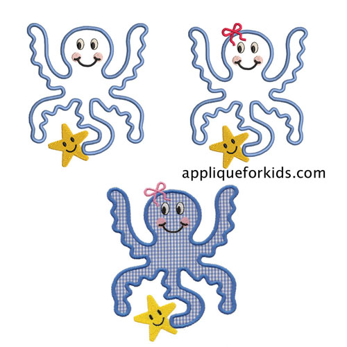 This octopus is sooo happy! Comes as a boy or girl. Boy is the same without the bow. Both are in the folder & each one in the 3 sizes.