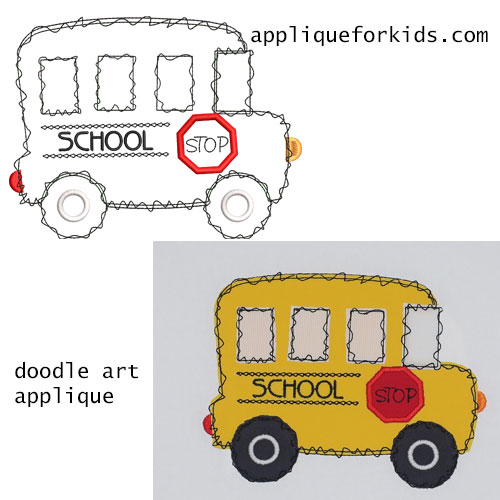 Make going back to school FUN! This doodle applique is fun to stitch and gives a look like a child's drawing - just perfect for t-shirts, back packs, etc. The fun part is, you do not have to cut close to the lines, leaving an uneven margin makes for a cute design!