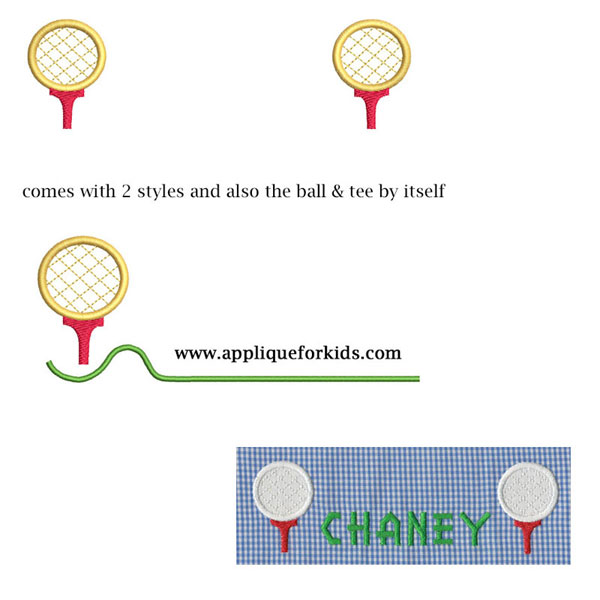 Display the golf fan's name or initials on collars, insets, rompers, towels, blankets, etc!! Really fun! The single ball & tee would be cute on pockets, romper legs, collars. etc.