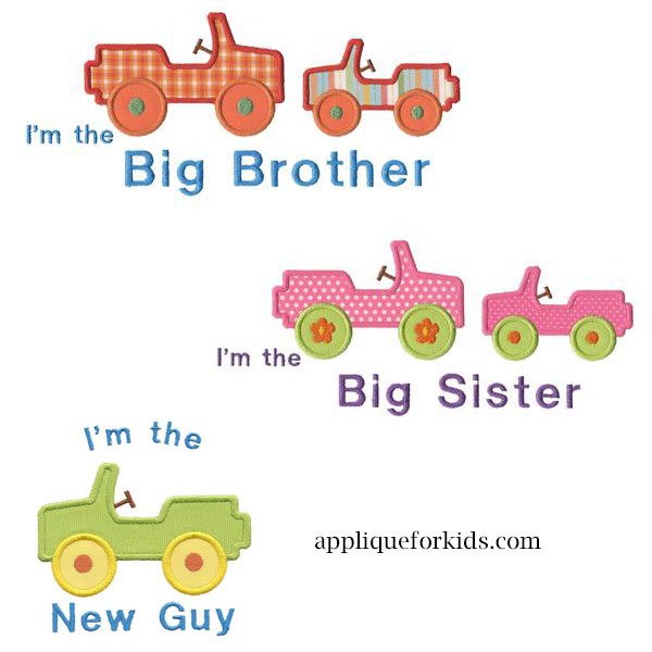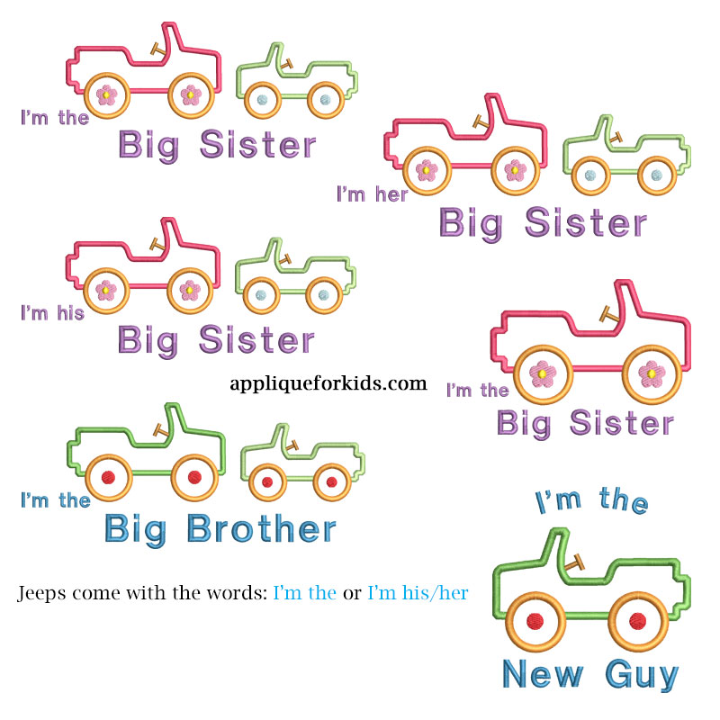 This brother & sister jeeps comes set with the words: I'm the or I'm his/her. So you can choose what application you need. The large size has the 2 jeeps, while the medium & small have one jeep. The New Guy is for the new addition to the family.