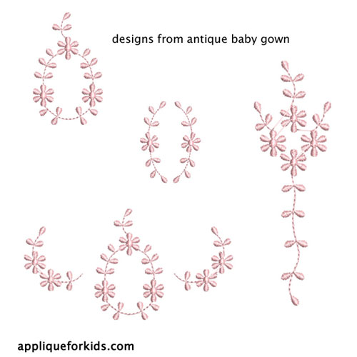 So sweet for embellishing baby's gown. Designs came from an antique garment. These are intended for light weight, Heirloom type fabrics - tone on tone - for a hand sewn look. 4 designs