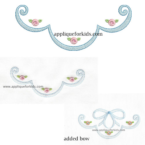 Make something beautiful with this scroll & flowers. Gives a hand sewn Heirloom look.  Add an initial or another design. Skipe the flowers if you do not want them.