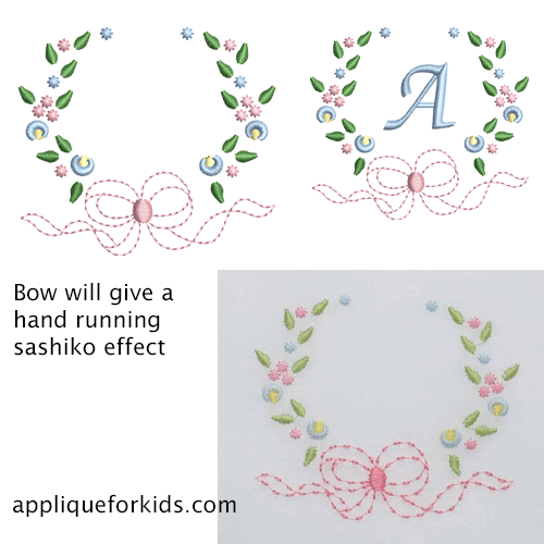 Very pretty and dainty embroidery design. Great as is, or add an initial to make it even more special. The bow will give a hand stitched sashiko look.