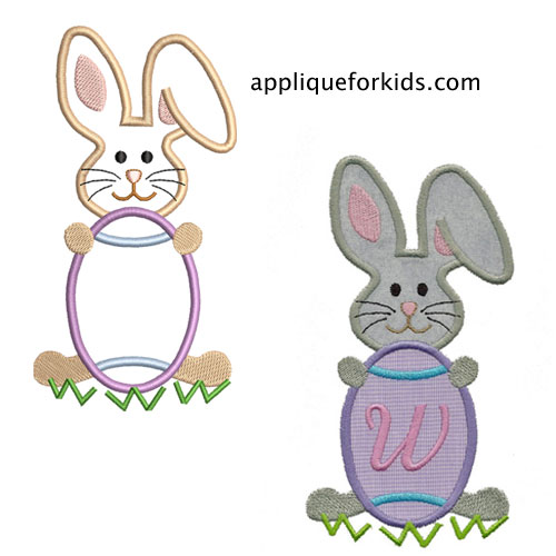 Little bunny is so proud to display his friend's initial! Even without an initial this is still a cute & fun design! The small size for the 4x4 hoop does not have the grass.
