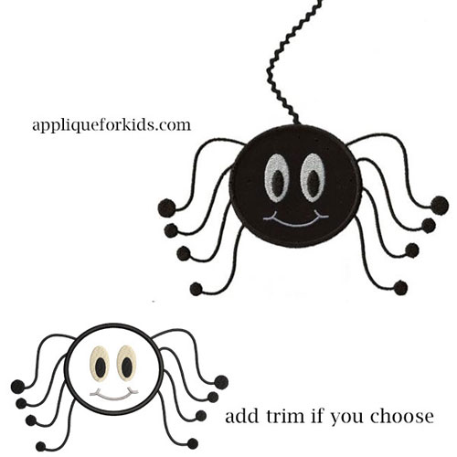 This spider isn't too scary! In fact, I bet your little one won't be frightened at all! Very easy one piece applique. The design can be as long as you want it to be using the trim of your choice. Can use a trim from 1/8" up to 5/8" . The trim can of course be skipped for just a spider.