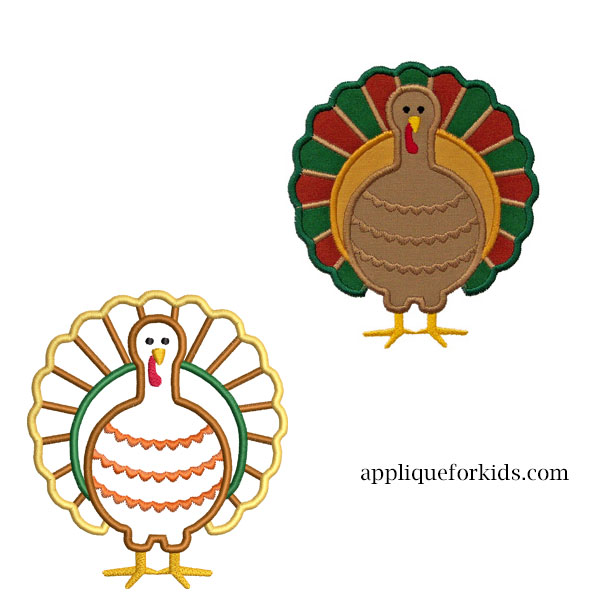 Turkey is looking to be put on a garment & not the table! He would be cute on placemats too. This design can have many differnt color combinatios. The back feathers will sew out in 2 applique pieces & not each individually, so it is very easy to do!