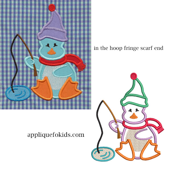 This penquin if fishing for some fun! Your little one will have fun while wearing this applique too! The easy directions for the fringe on the scarf is included.
