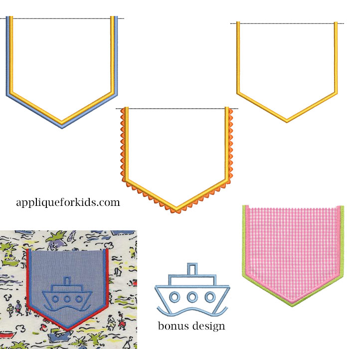 Finishes a pocket perfectly! Three different stlyes in 3 sizes! Plus a bonus embroidery design! Great for boys & girls. Easy complete directions included.
