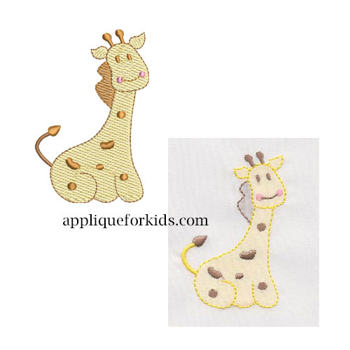 This sweet giraffe is perfect for day gowns, collars, yokes, pockets, etc. Try placing it on a pleat at the center front of a garment. Very easy - directions in folder for shadow work by machine.