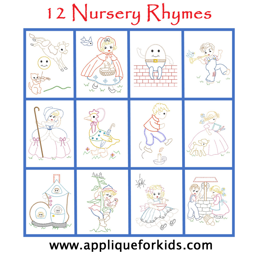 Set of 12 nursery rhymes are great for making a quilt, or used as an indivdual design. So sweet for baby and toddlers. Designs are also sold as individual designs.