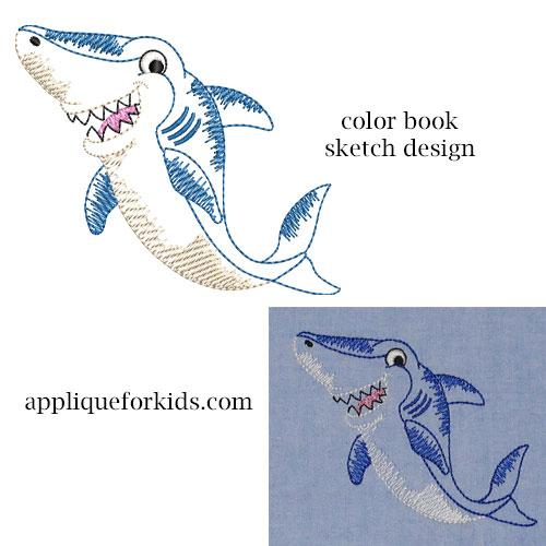 Fun and quick to stitch! Boys love sharks - stitch it in pink for the girls! The color book sketch designs are softer for the kids to wear than a normal fill or applique.
